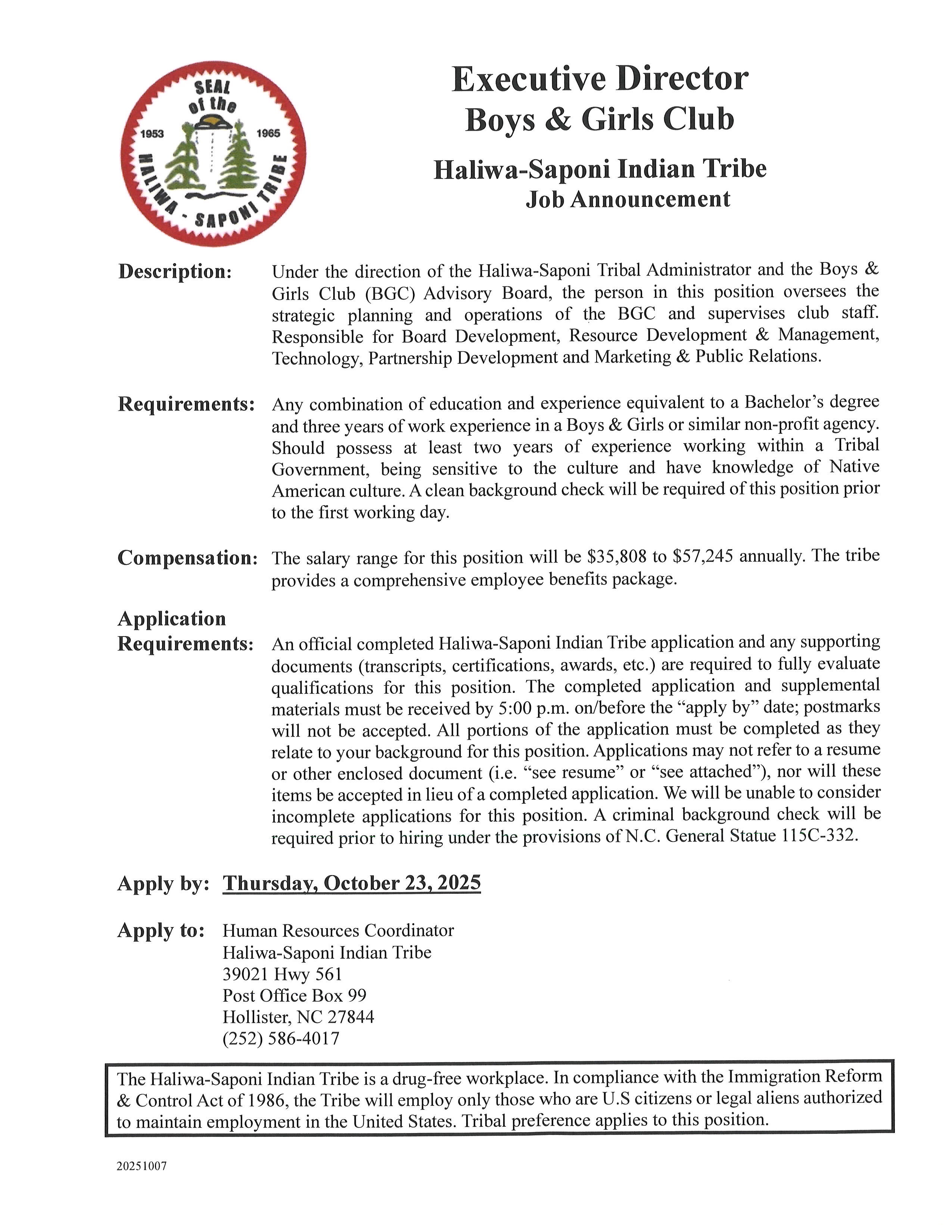 If you have any questions, or to submit your application or cover letter with resume electronically, please submit to: jobs@haliwa saponi.gov.
